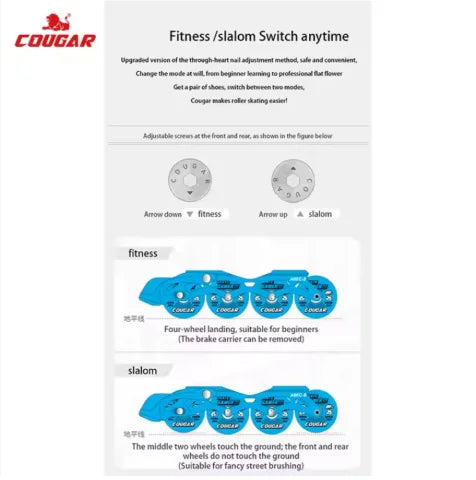 Product benefits: Push button adjustable system, CNC Aluminum Frames, Slalom and Fitness changeable